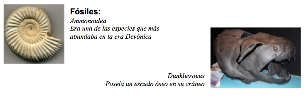 : En el Devónico predominan los Goniatites, que se utilizan como fósiles característicos de zonas, y los Braquiópodos, con numerosos géneros característicos y frecuentes (Spirifer, Strophomena, Atrypa etc.) utilizados como fósiles guía en facies arenosas y pizarrosas donde faltan los Goniatites.